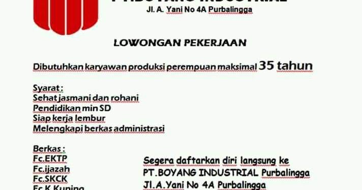 Loker Dinas Purbalingga - Syarat Pendaftaran Pt. Boyang Purbalingga / Loker Dinas ... - Home > lowongan kerja > lowongan kerja purbalingga maret 2021 terbaru minggu ini.